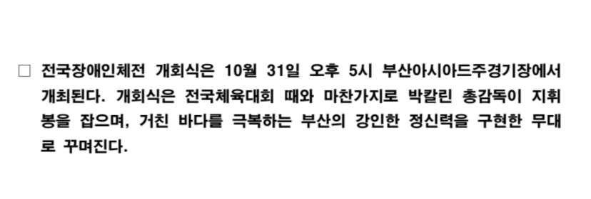부산시에서 하는 말씀 부산시 체육국장님이 이렇게 말씀하셨어요. "이번 부산 전국장애인 체전 개막식은 선수들한테 용기를 주고, 시민들한테는 감동을 줄 거예요. 부산이 얼마나 좋은 도시인지 전국에 알리는 기회가 될 겁니다." 맞는 말씀이에요. 우리 부산이 이렇게 큰 행사를 여는 거니까, 부산 사람들이 많이 와서 응원해줘야죠.
