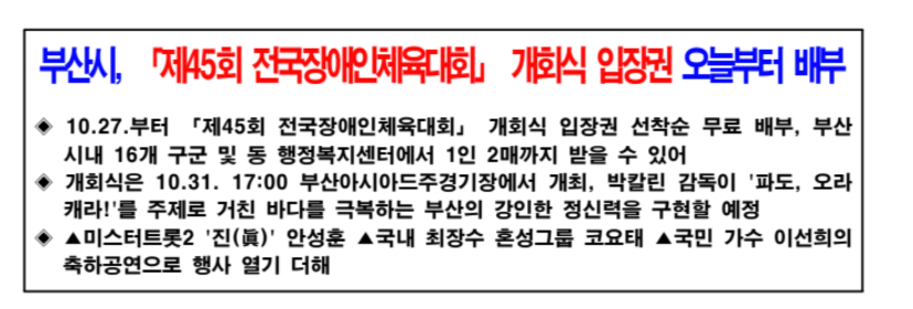 오늘은 정말 좋은 소식을 전해드리려고 합니다. 부산에서 10월 31일 목요일 저녁 5시에 제45회 전국장애인체전 개막식이 열리는데요. 입장권을 무료로 나눠드린답니다. 오늘(10월 27일 월요일)부터 받으실 수 있어요. 이번 행사는 특별합니다. 그냥 체육대회 개막식이 아니라, 우리가 좋아하는 가수들이 나와서 노래도 불러주거든요. 이선희 선생님, 안성훈 씨, 코요태가 모두 나오신답니다. TV에서만 보던 분들을 직접 볼 수 있는 기회예요.