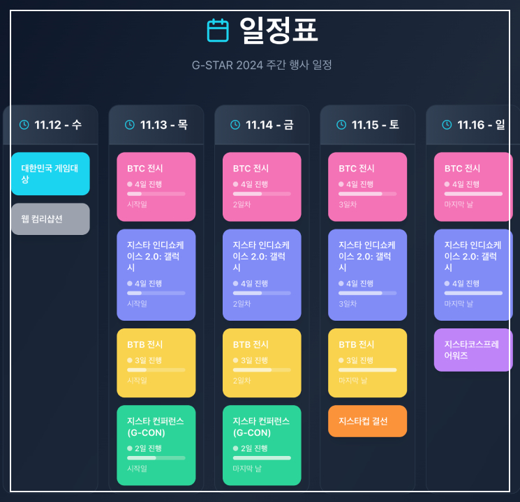 | 주요 행사 | 전시회, G-CON, 지스타컵 2025, 지스타 코스프레 어워즈 등 | |